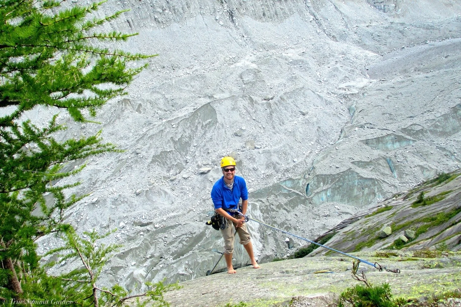 Our objective for the day, beyond simply gaping at the scene displayed before us, was to check out the steep Montenvers slabs above the glacier. These rock slabs remain modern evidence of the past volume and movement of the Mer de Glace, as it carved and polished the rock while both descending and receding along the trough of the valley. We are reminded of our time spent at the Gorges du Verdon as we prepare to rappel into the unknown with the hopes of climbing back out again. I chose a six-pitch 5.9 route called Josiane for our afternoon’s exploration. The glacier has of course receded due to global warming, and in the last decade this route has been altered as well. Just a handful of years ago, the route actually started from the edge of glacier itself, but now this is no longer possible. It certainly makes you appreciate being able to experience a massive glacier like this in person, and to see it from the unique perspective of climbing above it perhaps makes it even more impressive.